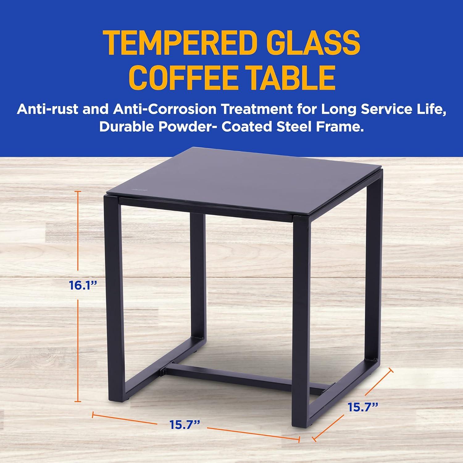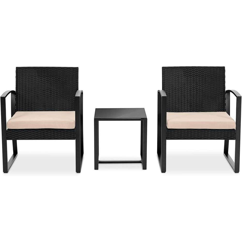 Features: Easy to Assemble and Move Modern Design for Modern Life Soft Cushions for Comfortable Sit Smooth and Very Relaxing Anti-rust and Anti-Corrosion Treatment for Long Service Life Durable and Sturdy Rattan Wicker Easy to Assemble Tempered Glass Coffee Table Zipper Designed Cushion Covers for Easy Detachable Outdoor/Indoor Patio Furniture with Washable Cushions Comfortable Beige Seat Cushions made with Water-resistant Fabric Black Weather-Resistant Resin Wicker Rattan Durable Powder-Coated Steel Frame Ideal for Patio, Backyard, Porch, Garden, Poolside, Balcony, or Pool Side Area What's in the Box: (2) Single-Seat Chairs (1) Glass Coffee Table Technical Specs: Construction Material: PE Rattan & Steel Frame Rattan Color: Black Cushion: Beige Polyester Fabric and Sponge Padded Max. Load Capacity: 264.6 lbs. Single Chair (L x W x H): 23.2” x 24.8” x 15.4”/28.7 -inches Table (L x W x H): 15.7” x 15.7” x 16.1” -inches Cushion for Single Chair (W x D): 19.7” x 17.7’’ x 1.97” -inches Sold as: 1 Weight: 1 lbs.