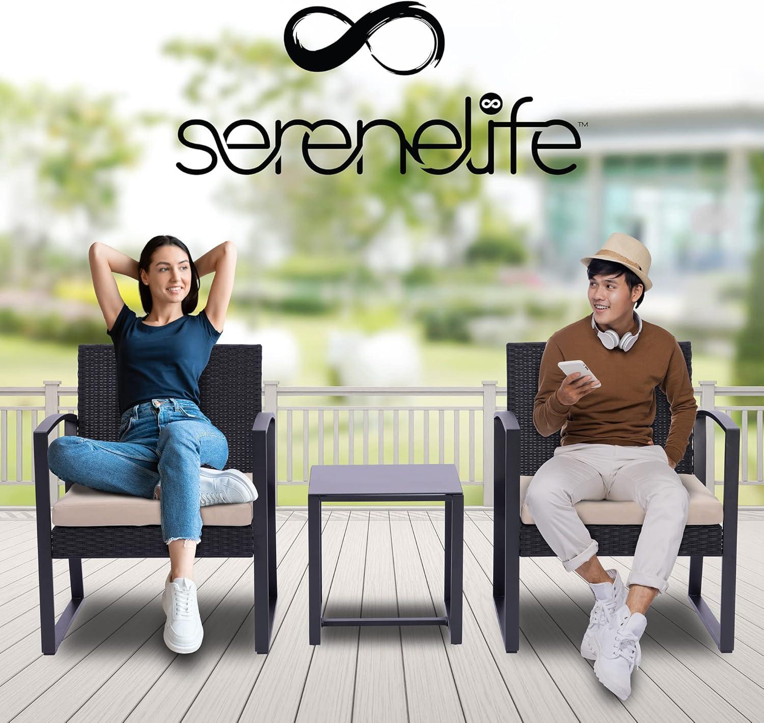 imageSereneLife 3 Piece Chat Set Outdoor Living Rattan Furniture Set Includes 2 Includes 2 Single Chairs wCushions and 1 Glasstop Coffee Table Brown