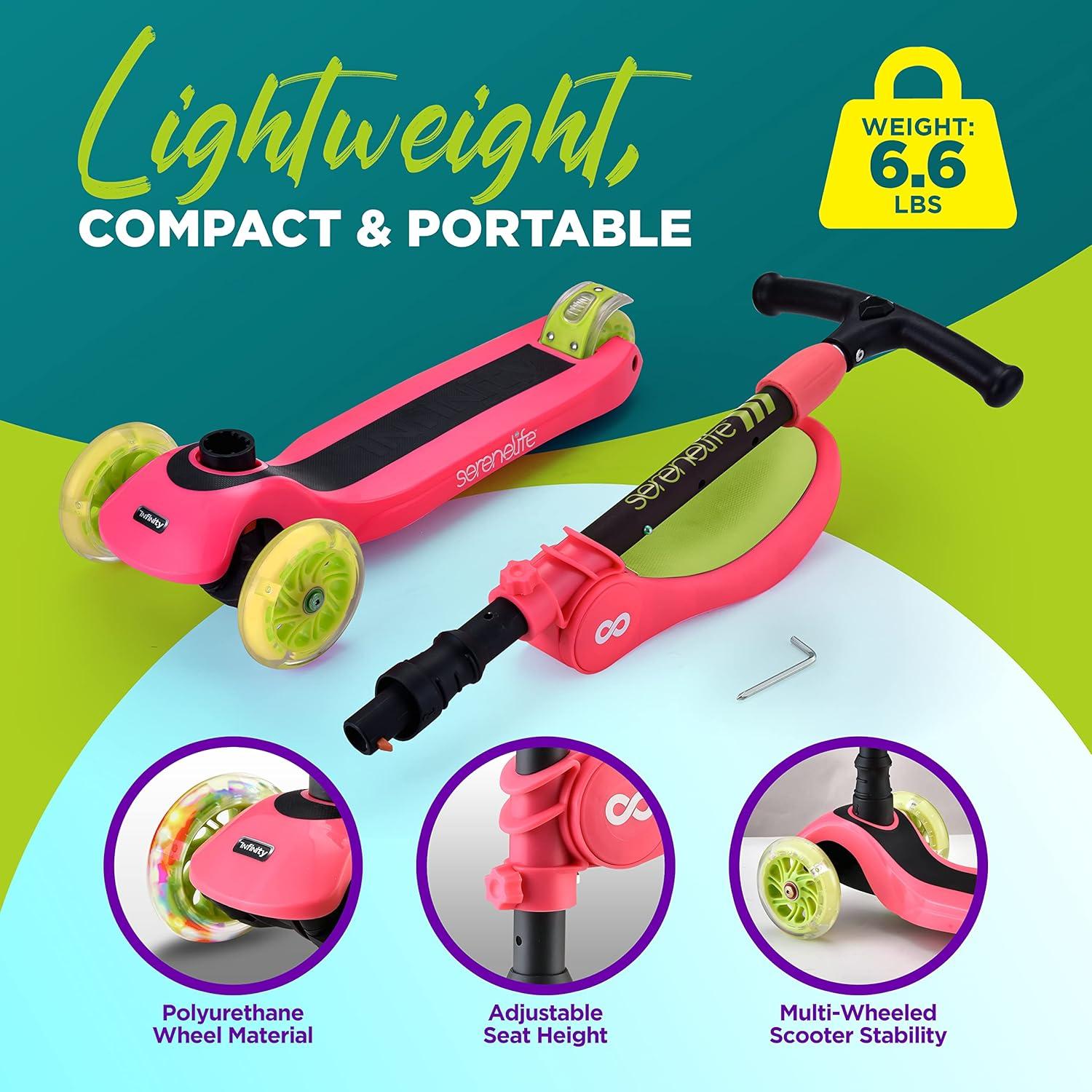 MULTI-COLOR WHEEL LIGHTS: The Infinity 3-Wheel Kick Scooters for Kids feature colorful LED turning wheel lights that light up in a variety of flashing colors as you scoot, adding a fun twist to the ride! It also makes the scooter stand out