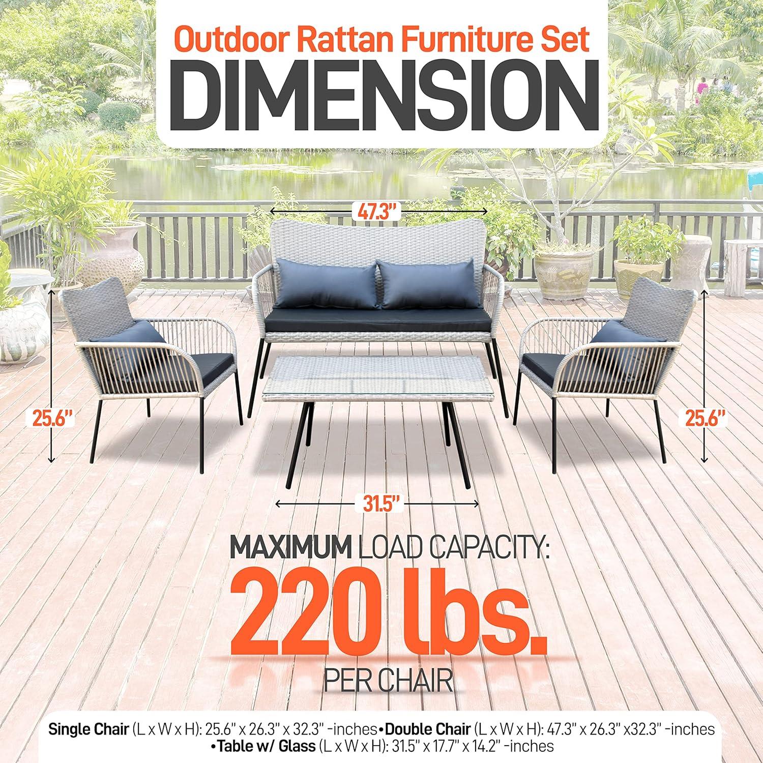 CREATE A COZY OUTDOOR SEATING AREA: This complete rattan set includes 1 love seat (47.3” x 26.3” x32.3”), 2 single chairs with cushion (25.6” x 26.3” x 32.3” each), and 1 glass top coffee table (31.5” x 17.7” x 14.2”). Perfect for creating a comfortable and inviting space for relaxing, entertaining, and spending quality time with family and friends.