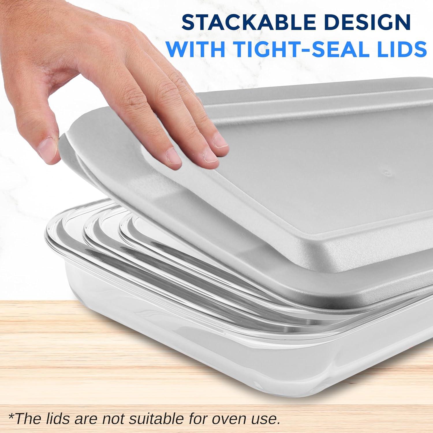 CONVENIENT SIZES: Includes four pans with lids: 31.03oz (10.16″ x 6.02″ x 1.77″), 55.17oz (11.61″ x 6.93″ x 2.01″), 75.86oz (13.58″ x 8.11″ x 2.05″), and 103.45oz (15.47″ x 9.29″ x 2.05″). Perfect for baking lasagna, casseroles, pastas, and more.