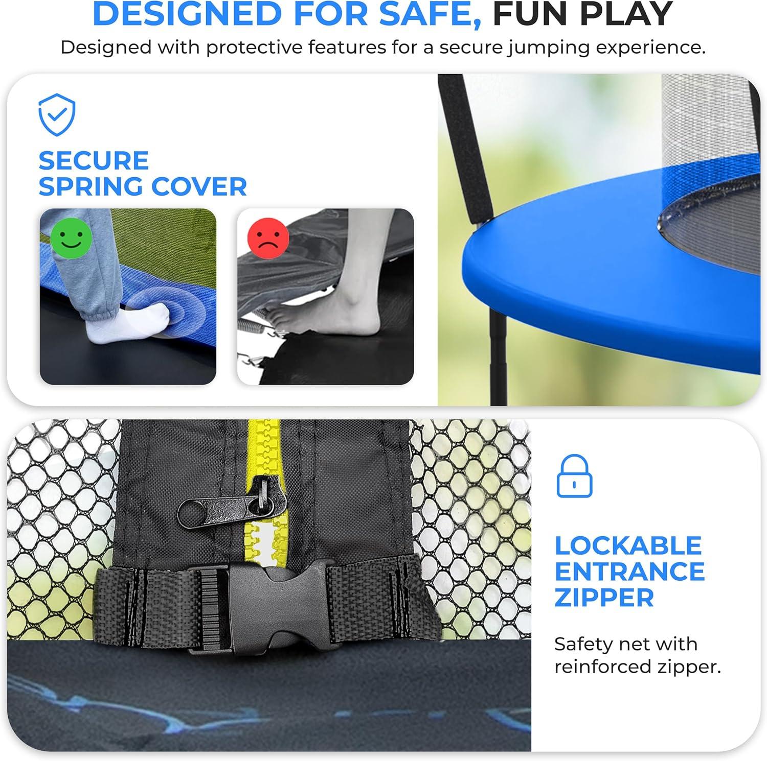 SAFETY DESIGN – This kid trampoline features curved poles, 70” tall netting with secure zippers, and padded spring covers for safe jumping. ASTM-certified materials ensure safety, giving parents peace of mind.