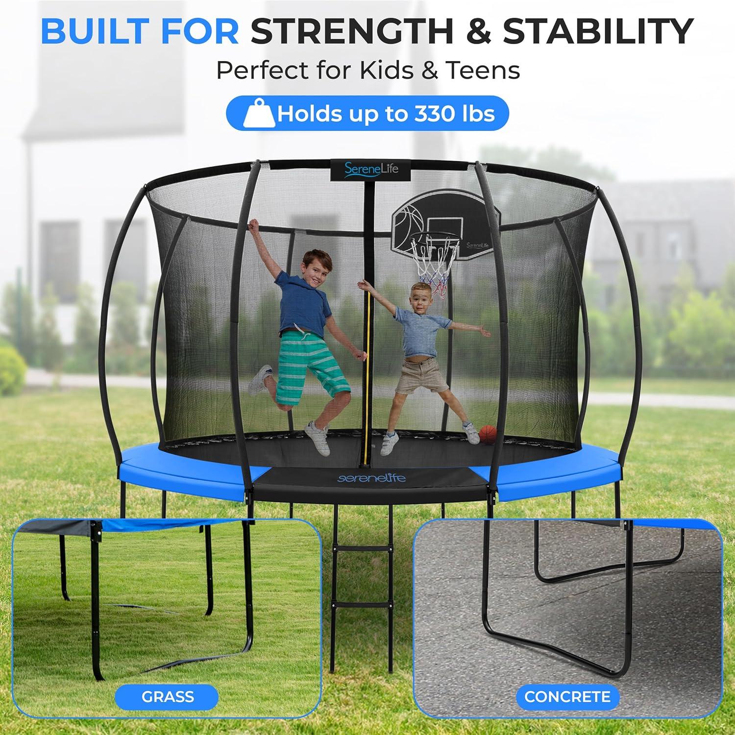 SereneLife 8FT 10FT 12FT 14FT Outdoor Trampoline for Kids – Recreational Backyard Trampoline with Curved Safety Poles and Net Enclosure- ASTM Approval for Kids Adults(10 FT)