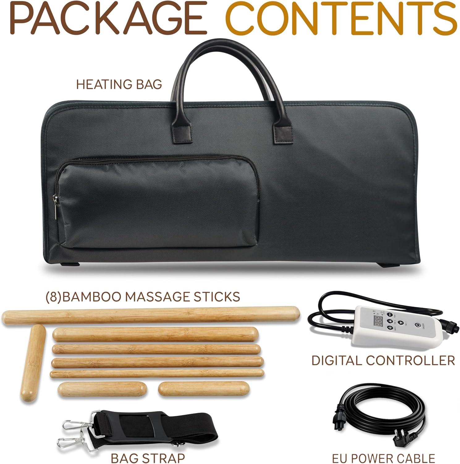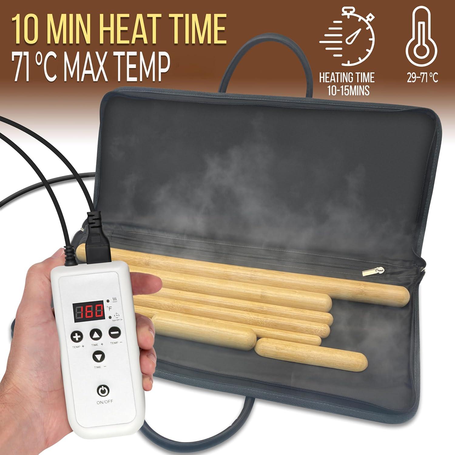 INCLUDES HEATING BAG: This electric bamboo massage warmer set comes with a lightweight, energy-efficient storage and travel bag that doubles as a heater for the bamboo sticks. It comfortably holds all 8 included bamboo massage sticks.