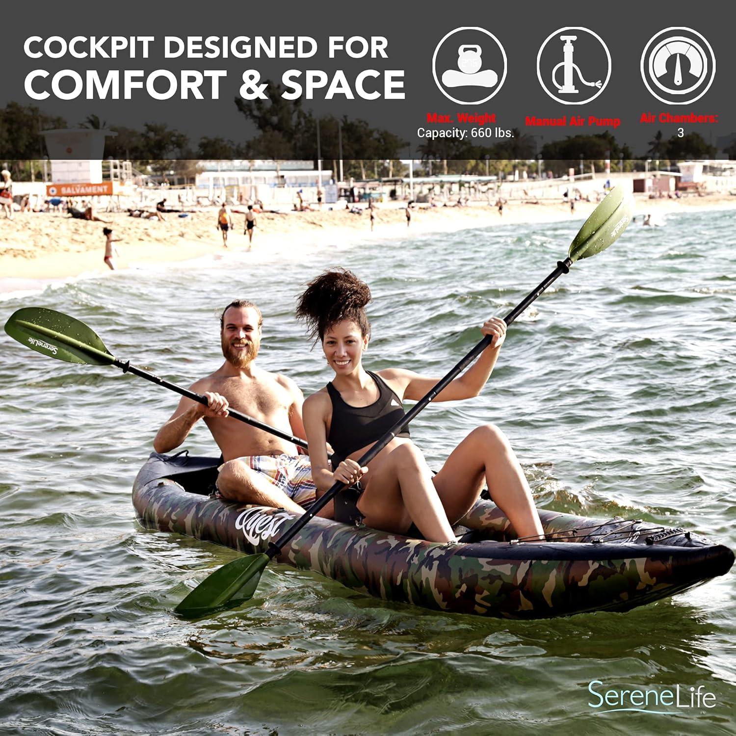 SPACIOUS 2-PERSON INFLATABLE KAYAK: Supports up to 660 lbs, designed for solo paddling or shared adventures, with enough room for two adults.