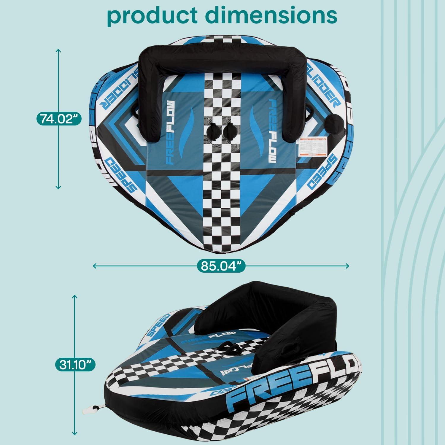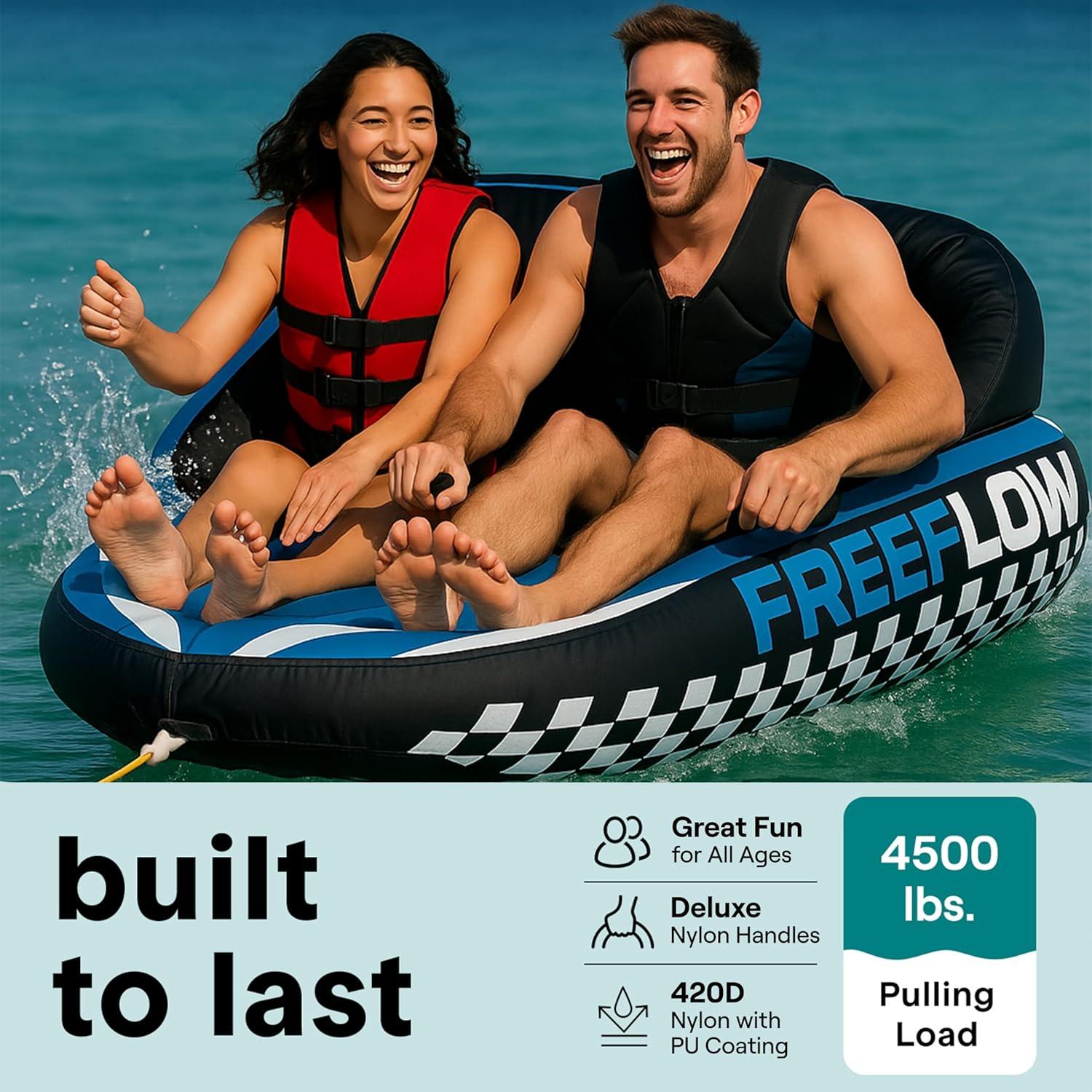 STABLE COCKPIT WATER TUBE: The Inflatable Towable Boat has a stable cockpit boating tube that ensures a secure ride for young and adult riders. The side by side seats provide enough room for 1-2 riders. Perfect for beach outing and water sports