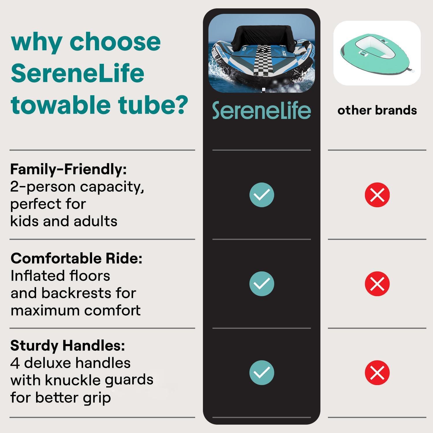 DELUXE NYLON HANDLES: Introducing deluxe nylon handles w/ neoprene knuckle guards along w/ high-performance slotted deck seating w/ slot dividers for added security. The 2 person towable tube boat also has inflatable floors for comfortable seating