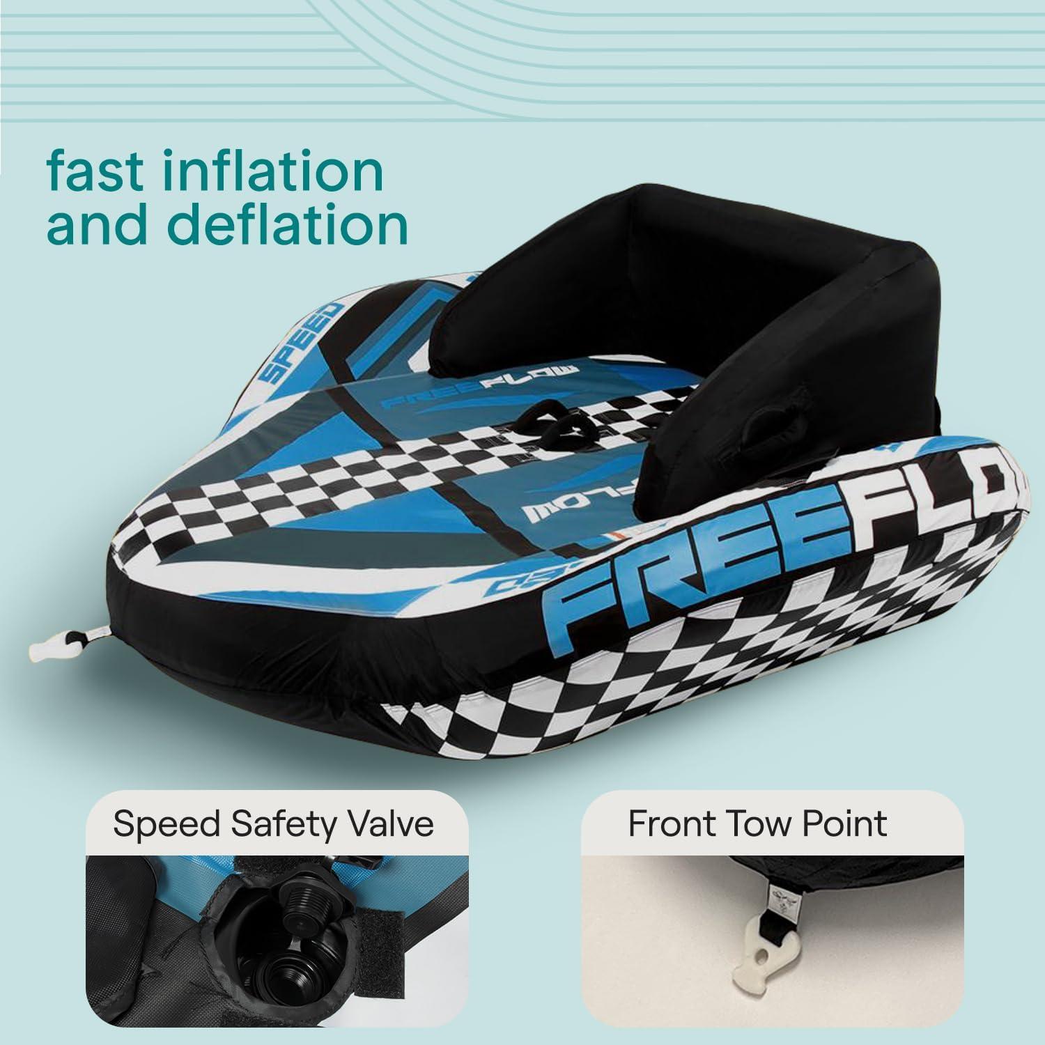 SAFETY VALVE: Features speed safety valve for fast and easy inflation and deflation, gets your towable tube ready in no time! Can be rolled up for easy storage and transport. Designed w/ heavy-duty PVC bladders and zippers w/ full-size EVA foam pads