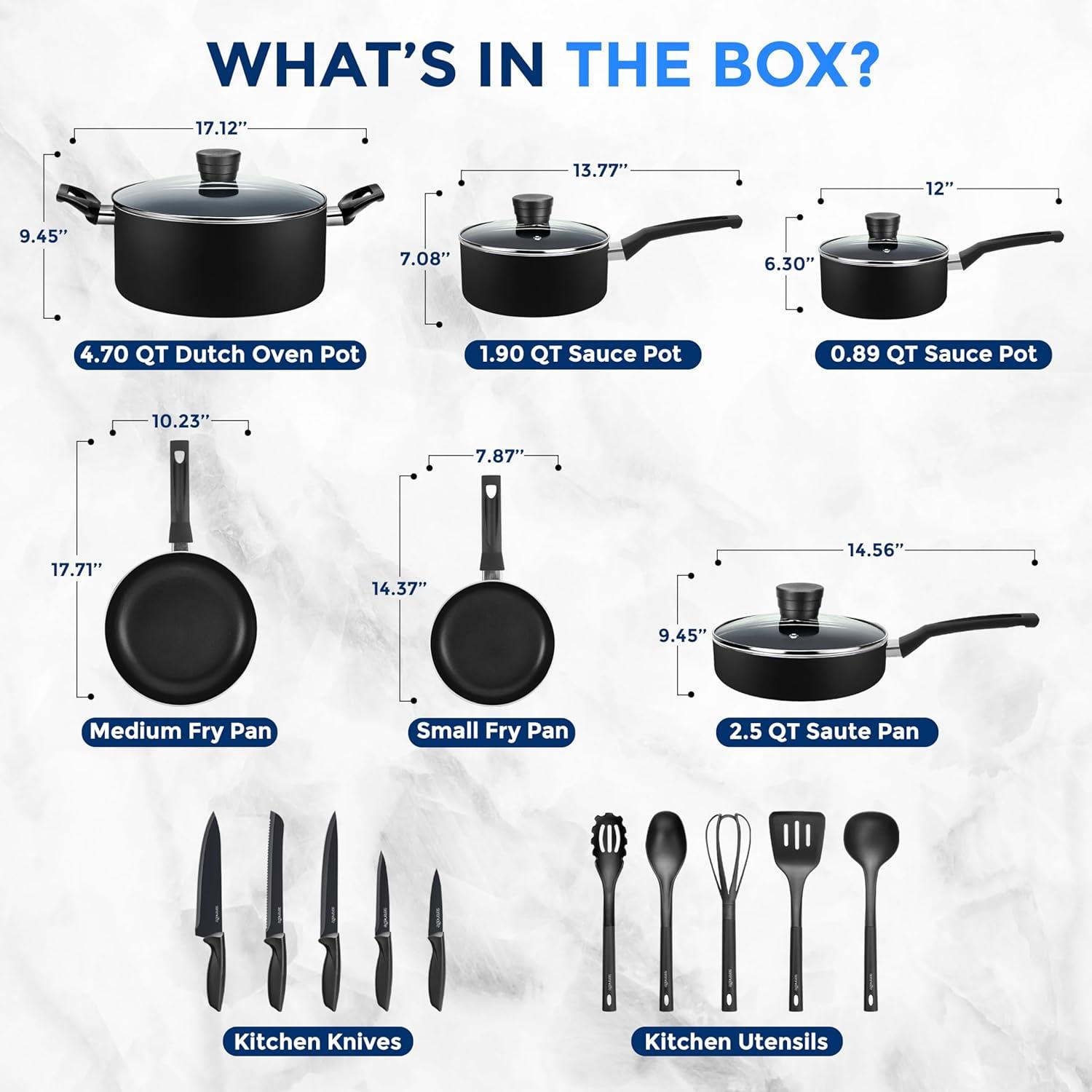 Features: – Basic Home Kitchenware – Black Non-stick Inside and Heat Resistant Lacquer Outside – Stylish Kitchen Cookware Design – Multi-Sized Cooking Pots with Lids – Small, Medium Skillet Fry Pans – Durable & Long Lasting Non-Stick Coating – Solid Italian Bakelite Handles – Effectively Distributes & Retains Heat for Even Cooking All-Around – See-Through Tempered Glass Lids – Stain-Resistant & Easy-to-Clean – Dishwasher Safe – Includes Heat-Resistant Kitchen Tool Utensils & Qualified Knife Set – Food-Grade Safe – Pots & Pans Safe for Gas, Electric & Ceramic Counter Cooktops – PFOA/PFOS FREE What’s in the Box: – Sauce Pot with Lid, (0.89 qt) – Sauce Pot with Lid, (1.90 qt) – Dutch Oven Pot with Lid, (4.70 qt) – Saute Pan with Lid, (2.5 qt) – Small Fry Pan, 8-Inch – Medium Fry Pan, 10-Inch – Solid spoon – Slotted Spatula, – Pasta Server – Soup Ladle – Egg Whisk – Chef Knife – Bread Knife – Slicer Knife – Utility Knife – Paring Knife Technical Specs: – Max Temperature: 350° Fahrenheit (180° Celsius) – Construction Material: Pressed Aluminum Metal, – Engineered Bakelite & Nylon & PP, Tempered Glass, 3CR13 Metal – Interior Coating: Basic Black N/S coating, Exterior Coating: Heat Resistant Lacquer – Coating Thickness: 20-25 um, 2.5mm Pressed Aluminum – Material Metal Hardness:1-2 HB – Saucepan Pot Size (L x W x H): 12’’ x 6.30’’ x 4.72’’ – inches (with Handle&Lid) – Saucepan Pot Size (L x W x H): 13.77’’ x 7.08’’ x 5.31’’ – inches (with Handle&Lid) – Sauté Pan Size (L x W x H): 14.56’’ x 9.45’’ x 6.88’’ -inches (with Handle&Lid) – Dutch Oven Pot Size (L x W x H):17.12’’ x 9.45’’ x 4.92’’ – inches (with Handle&Lid) – Small Fry Pan Size (L x W x H):14.37’’ x 7.87’’ x 1.57’’ -inches (with Handle) – Medium Fry Pan Size (L x W x H): 17.71’’ x 10.23’’ x 1.97’’ -inches (with Handle)