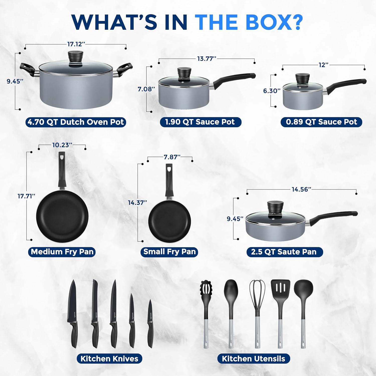Features: – Basic Home Kitchenware – Black Non-stick Inside and Heat Resistant Lacquer Outside – Stylish Kitchen Cookware Design – Multi-Sized Cooking Pots with Lids – Small, Medium Skillet Fry Pans – Durable & Long Lasting Non-Stick Coating – Solid Italian Bakelite Handles – Effectively Distributes & Retains Heat for Even Cooking All-Around – See-Through Tempered Glass Lids – Stain-Resistant & Easy-to-Clean – Dishwasher Safe – Includes Heat-Resistant Kitchen Tool Utensils & Qualified Knife Set – Food-Grade Safe – Pots & Pans Safe for Gas, Electric & Ceramic Counter Cooktops – PFOA/PFOS FREE What’s in the Box: – Sauce Pot with Lid, (0.89 qt) – Sauce Pot with Lid, (1.90 qt) – Dutch Oven Pot with Lid, (4.70 qt) – Saute Pan with Lid, (2.5 qt) – Small Fry Pan, 8-Inch – Medium Fry Pan, 10-Inch – Solid spoon – Slotted Spatula, – Pasta Server – Soup Ladle – Egg Whisk – Chef Knife – Bread Knife – Slicer Knife – Utility Knife – Paring Knife Technical Specs: – Max Temperature: 350° Fahrenheit (180° Celsius) – Construction Material: Pressed Aluminum Metal, – Engineered Bakelite & Nylon & PP, Tempered Glass, 3CR13 Metal – Interior Coating: Basic Black N/S coating, Exterior Coating: Heat Resistant Lacquer – Coating Thickness: 20-25 um, 2.5mm Pressed Aluminum – Material Metal Hardness:1-2 HB – Saucepan Pot Size (L x W x H): 12’’ x 6.30’’ x 4.72’’ – inches (with Handle&Lid) – Saucepan Pot Size (L x W x H): 13.77’’ x 7.08’’ x 5.31’’ – inches (with Handle&Lid) – Sauté Pan Size (L x W x H): 14.56’’ x 9.45’’ x 6.88’’ -inches (with Handle&Lid) – Dutch Oven Pot Size (L x W x H):17.12’’ x 9.45’’ x 4.92’’ – inches (with Handle&Lid) – Small Fry Pan Size (L x W x H):14.37’’ x 7.87’’ x 1.57’’ -inches (with Handle) – Medium Fry Pan Size (L x W x H): 17.71’’ x 10.23’’ x 1.97’’ -inches (with Handle)