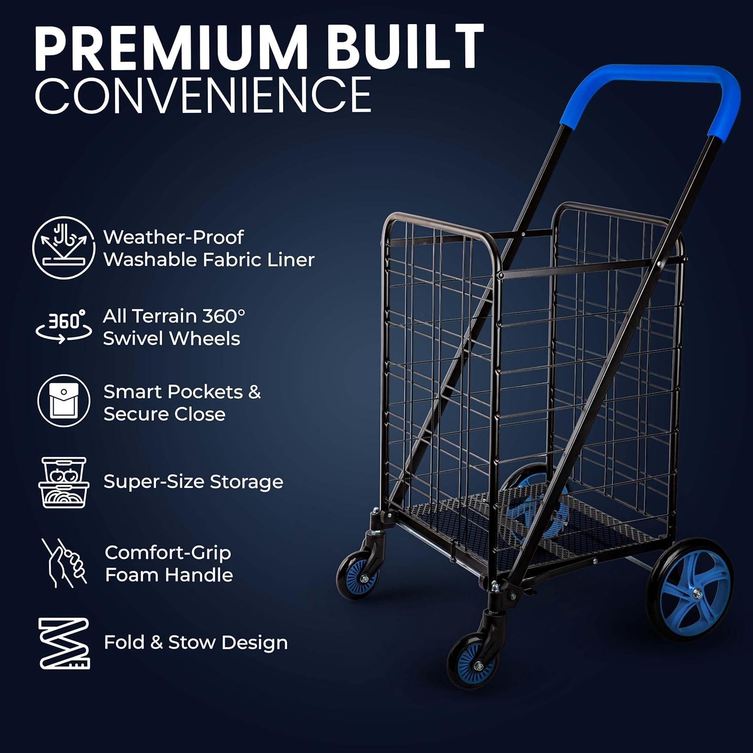 EXTRA CONVENIENT FEATURES – Quick and tools-free assembly gets you ready to roll in no time with our collapsible grocery cart. The detachable cart liner is easy to clean, and the stable low center of gravity design prevents tipping.