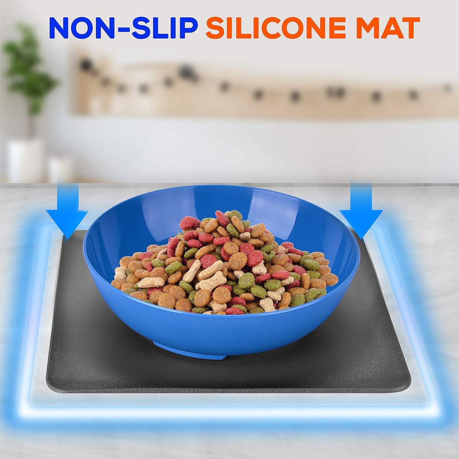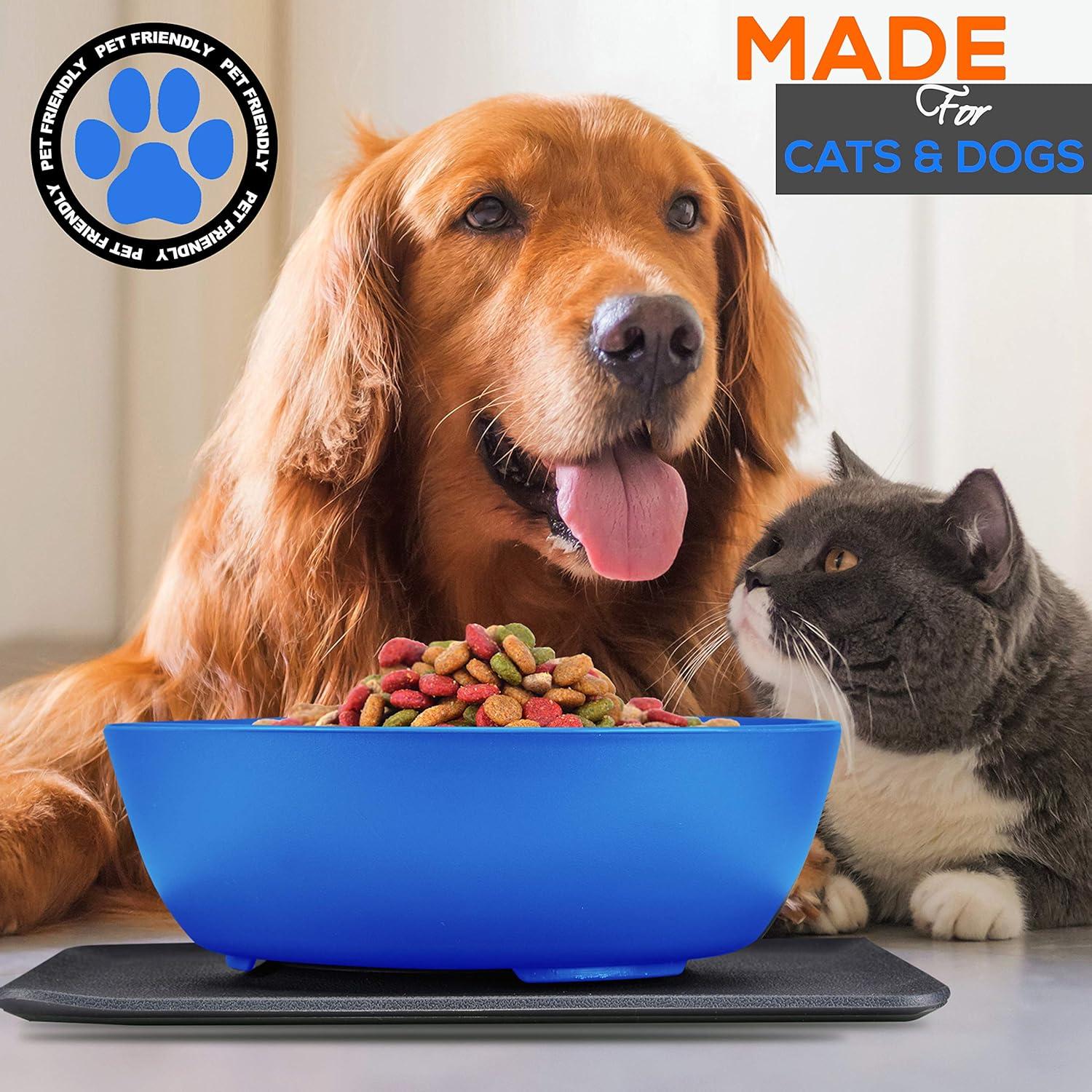 NON-SKID BASE: The dog kitty food bowls and waterproof non skid pet food mat set features a rubber mat that uses suction for a powerful floor grip so it won't slip and slide across the floor during mealtime yet peel off without any hassle