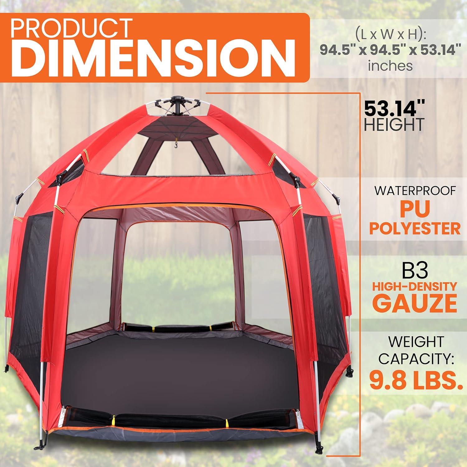 COMPACT & PORTABLE: The outdoor playpen for baby is designed for on-the-go use and can be easily transported with its compact design and included travel bag with shoulder strap. Ideal for use as a home playpen, outdoor tent, or portable play yard.