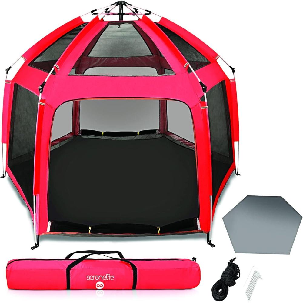 AMPLE PLAY AREA: With dimensions of 7’ x7’' x 4.25’ feet, this SereneLife outdoor covered playpen provides ample space for your child to play or for you and your baby to relax.AMPLE SPACE INSIDE: SereneLife outdoor covered playpen for baby gives you ample space for your child to play around or for you and your baby to relax. Measures (L x W x H): 86.6'' x 86.6'' x 51.2'' -inches