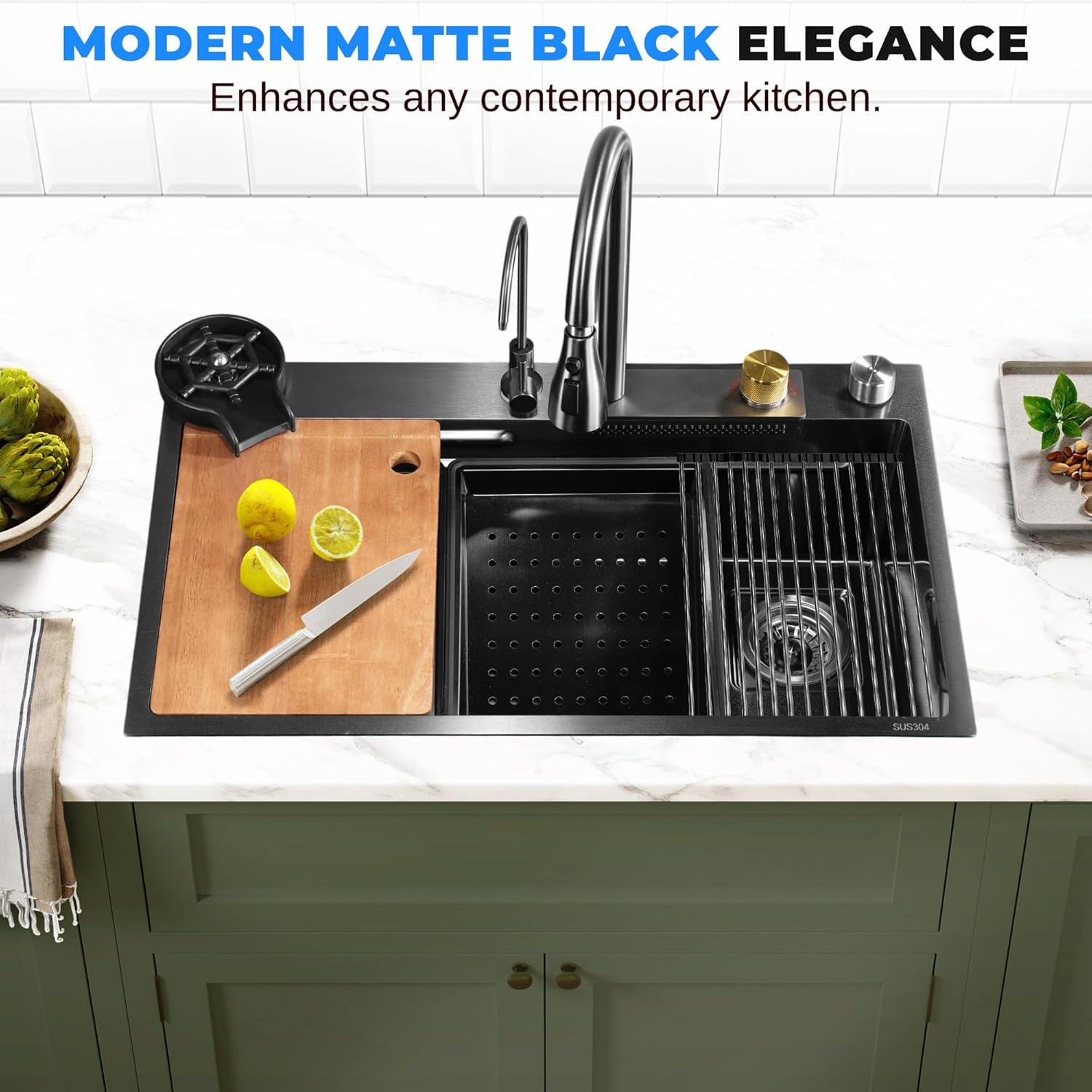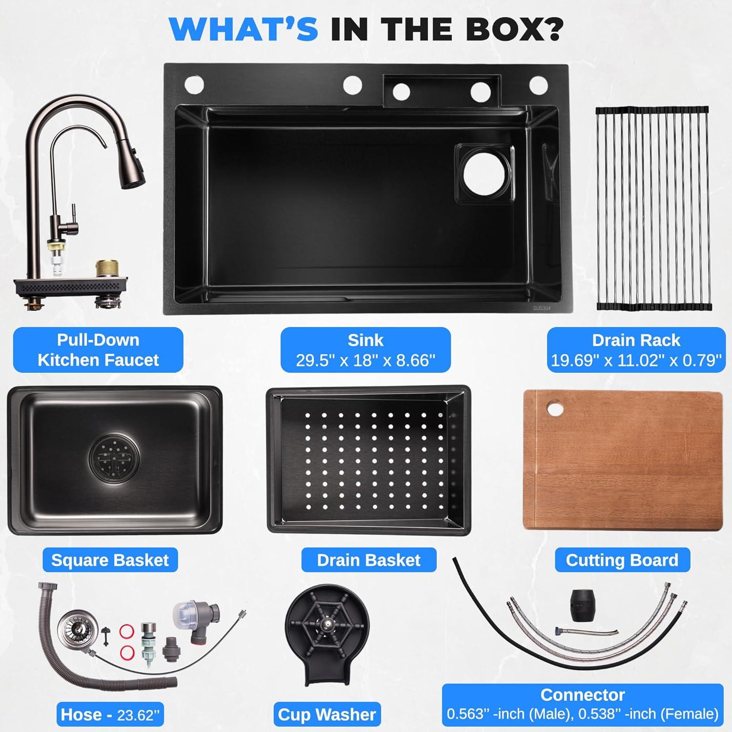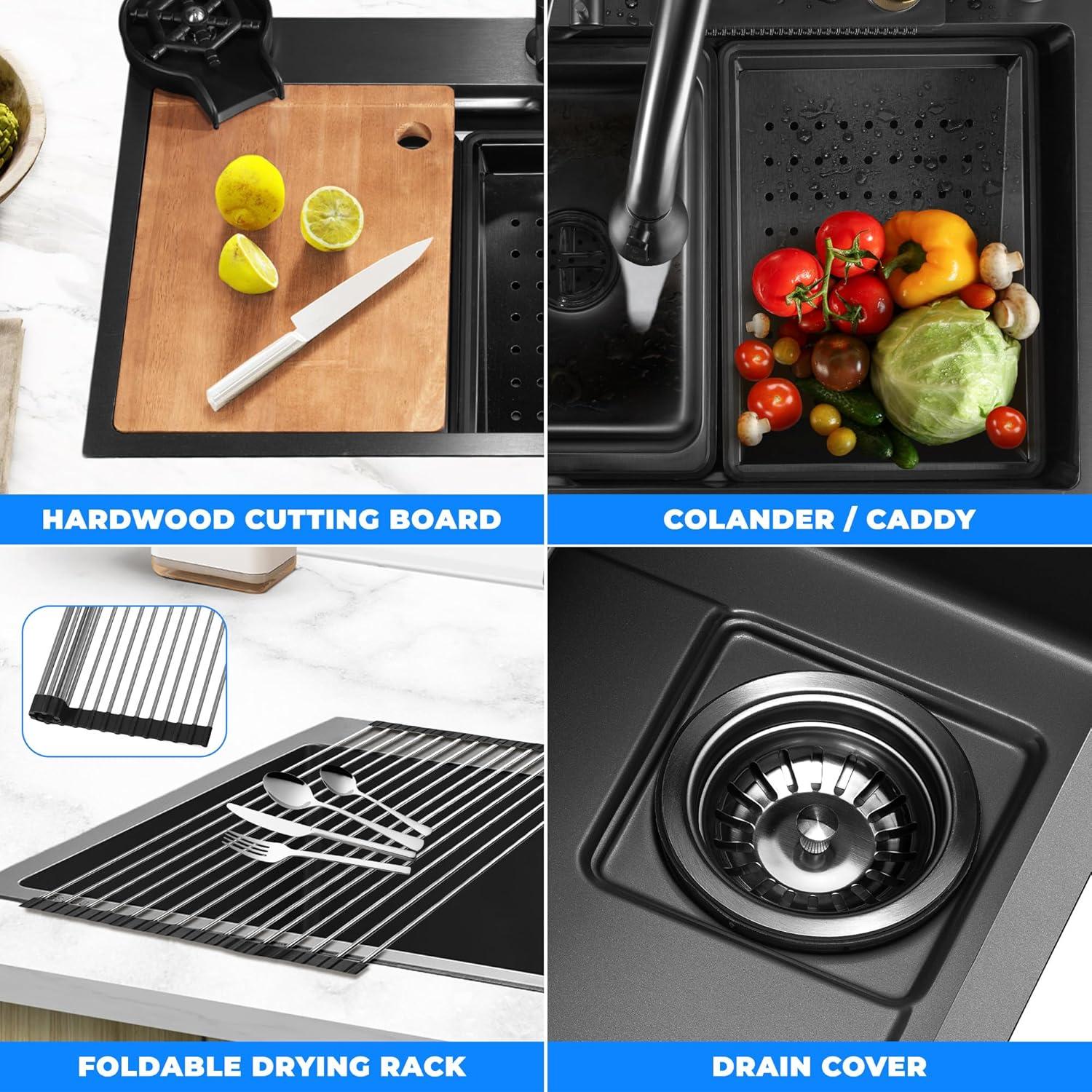 COMPLETE KITCHEN SOLUTION – Upgrade your kitchen with this comprehensive package, including a stainless steel kitchen sink, drain rack, shower faucet, water purifier tap, square basket, basin spray, cutting board, and cup washer.