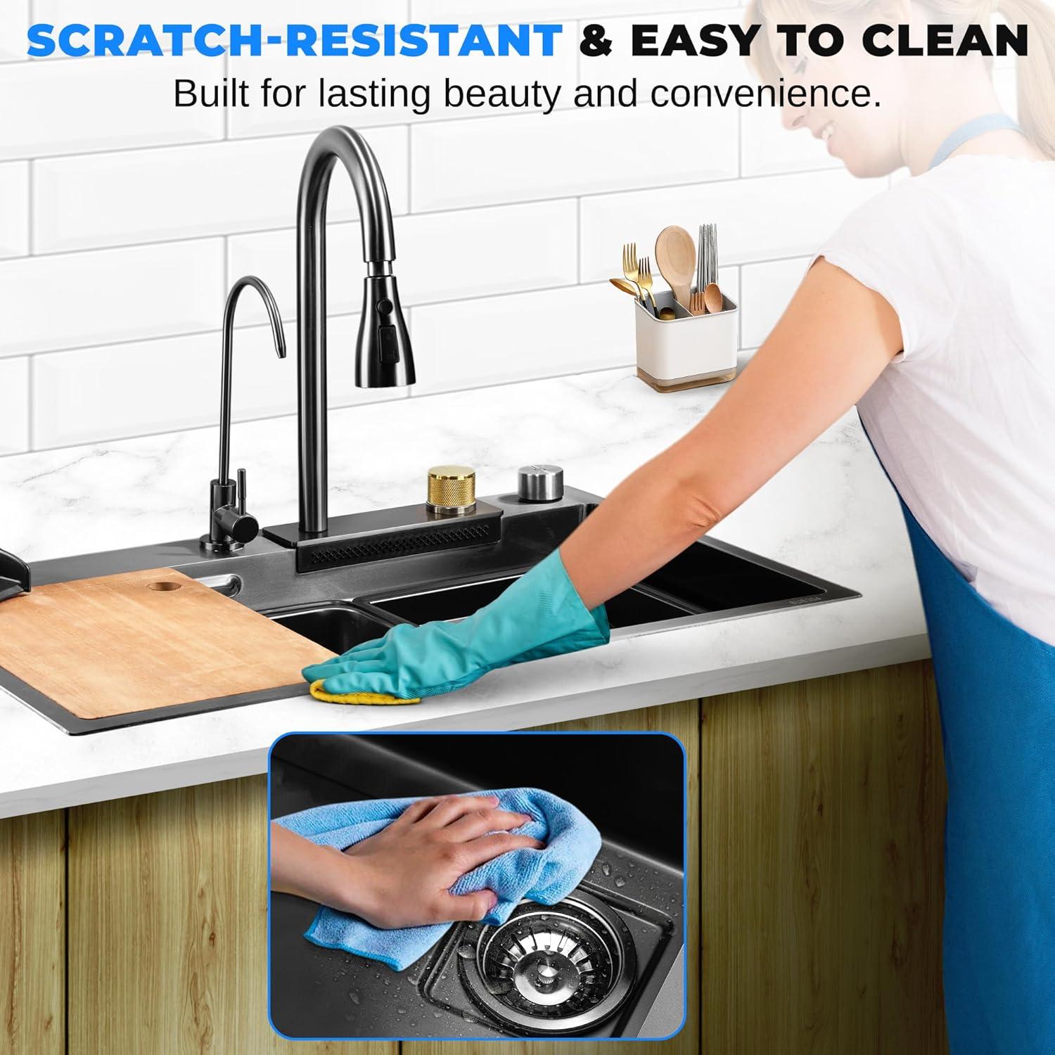 Introducing our Gun Black Durable Stainless-Steel Sink, a perfect blend of modern style and robust functionality for your contemporary kitchen. Crafted with precision and designed to elevate your kitchen aesthetics, this matte and stylish stainless-steel sink is a versatile addition that complements various countertop materials. Its high durability ensures resistance to dents, chips, and cracks, making it a long-lasting choice for busy kitchens. The sink's coating not only enhances its sleek appearance but also contributes to easy cleaning and maintenance, keeping it free from stains and corrosion. The soundproof feature minimizes noise during dishwashing, and the sink's sloped bottom and efficient drainage design add to its practicality. This package comes complete with essential accessories, including a stainless-steel sink drain, drain rack, shower faucet, water purifier tap, square basket, basin spray, cutting board, and cup washer. The construction materials, including SUS304 stainless steel for the sink, ensure durability and reliability. Upgrade your kitchen with this stylish, functional stainless-steel sink that combines form and function seamlessly.