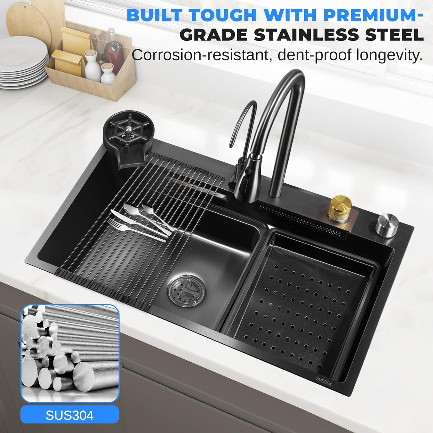 SereneLife Stainless Steel Kitchen Sink | Undermount & Drop-In Installation |13 Gauge & 30″L x 18″W x 9″H IN | Includes Faucet, Drain Rack, Strainer Basket, Cutting Board & Cup Washer | Black(Black)