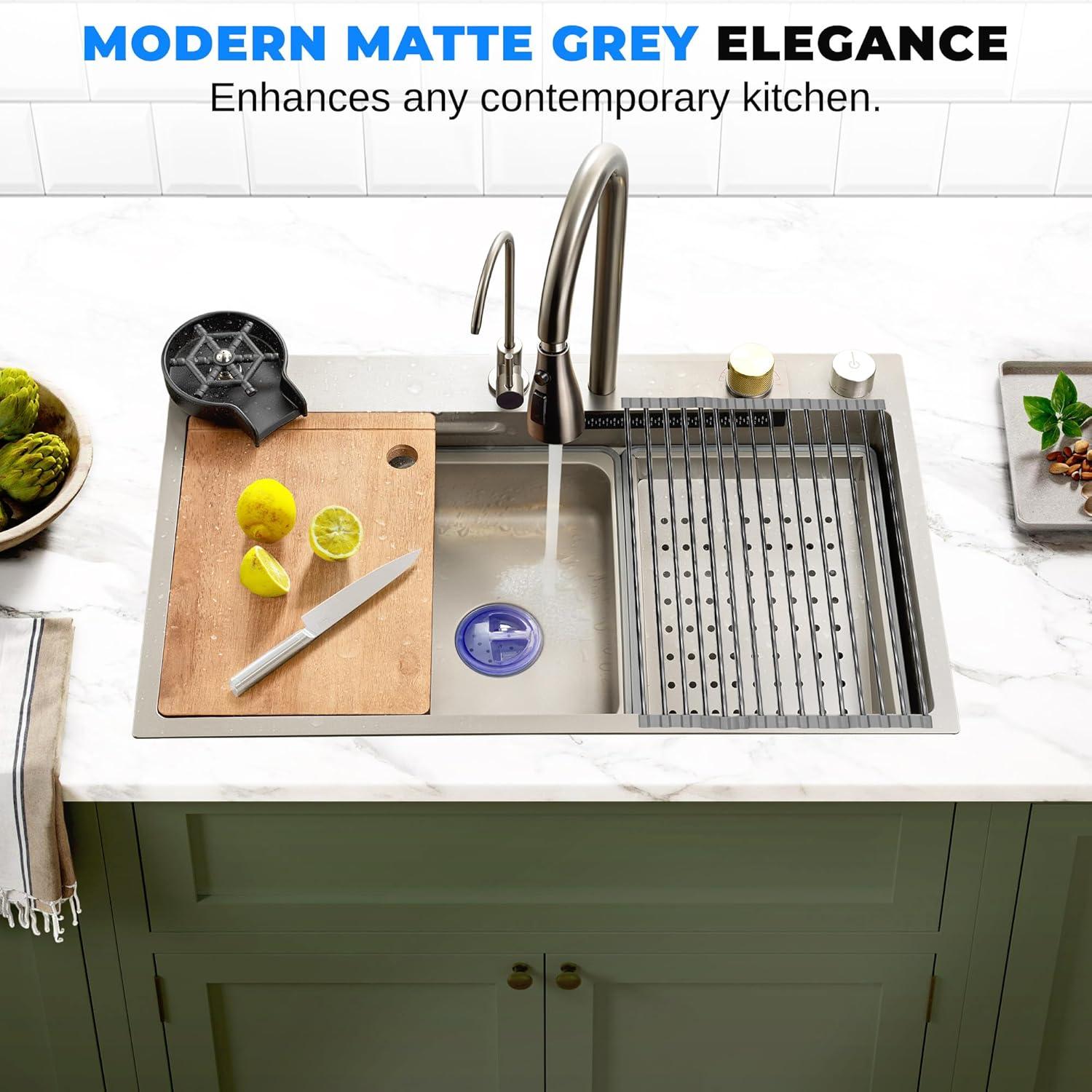 Introducing our Gun Black Durable Stainless-Steel Sink, a perfect blend of modern style and robust functionality for your contemporary kitchen. Crafted with precision and designed to elevate your kitchen aesthetics, this matte and stylish stainless-steel sink is a versatile addition that complements various countertop materials. Its high durability ensures resistance to dents, chips, and cracks, making it a long-lasting choice for busy kitchens. The sink's coating not only enhances its sleek appearance but also contributes to easy cleaning and maintenance, keeping it free from stains and corrosion. The soundproof feature minimizes noise during dishwashing, and the sink's sloped bottom and efficient drainage design add to its practicality. This package comes complete with essential accessories, including a stainless-steel sink drain, drain rack, shower faucet, water purifier tap, square basket, basin spray, cutting board, and cup washer. The construction materials, including SUS304 stainless steel for the sink, ensure durability and reliability. Upgrade your kitchen with this stylish, functional stainless-steel sink that combines form and function seamlessly.