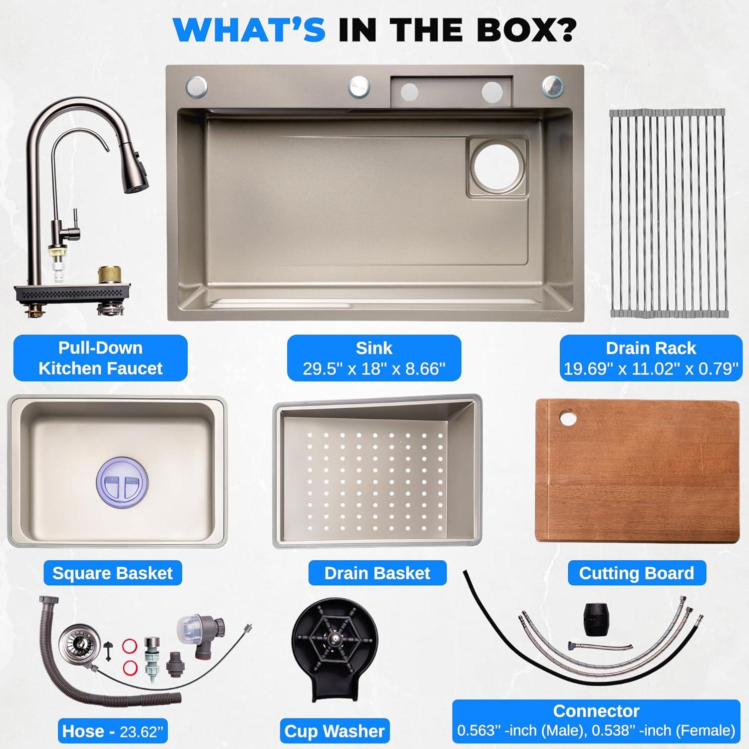 COMPLETE KITCHEN SOLUTION – Upgrade your kitchen with this comprehensive package, including a stainless steel kitchen sink, drain rack, shower faucet, water purifier tap, square basket, basin spray, cutting board, and cup washer.