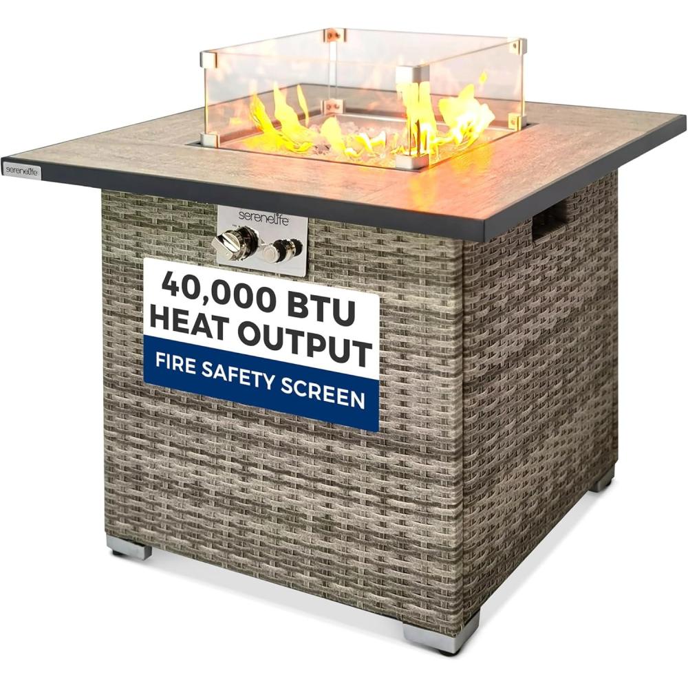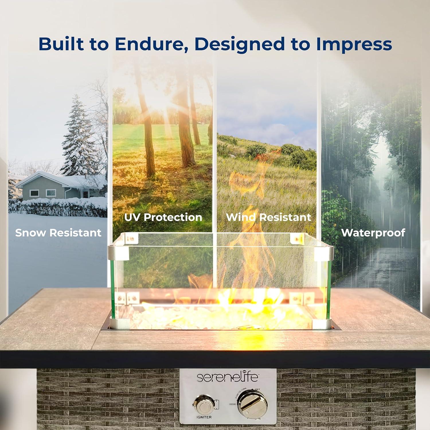 The Outdoor Gas Fire Pit Table is a perfect blend of elegance and functionality, designed to enhance your patio or backyard. This 30-inch square propane fire pit table features a sturdy wicker base and a stylish tile tabletop, offering both durability and sophistication. With a powerful 50,000 BTU heat output and an adjustable flame height, this fire table provides ample warmth and a cozy atmosphere for any outdoor gathering. The stainless steel fire pan, burner with lid, and tempered glass wind guard ensure safe and efficient operation, while the auto flame-out protection device and pulsed igniters provide an added layer of security and easy ignition. Constructed with weather-resistant PE rattan and stainless steel, this table top firepit is built to withstand the elements, making it ideal for year-round use. The integrated propane tank storage with a steel panel door makes accessing and changing the tank simple and hassle-free. Complete with decorative clear glass rocks, an anti-static ground wire, and a waterproof cover, this propane fire pit table is ready for effortless assembly in just 20-30 minutes. Transform your garden, terrace, or balcony with this CSA-certified fire pit table that brings both warmth and an elegant touch to any outdoor space.